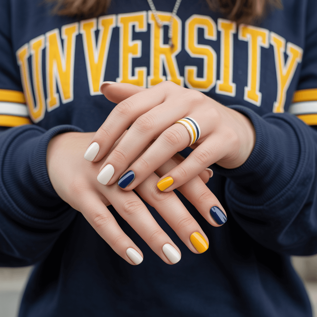 Stripes Over Solids: Instead of painting your entire nail a bold color, use a thin brush or striping tape to create one or two thin stripes in a school color over a neutral base.