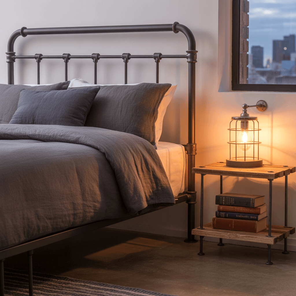 Accessorize with Purpose: Don’t clutter the space. Use open shelving (like iron piping and wood planks) to display books, a few favorite items, or plants. A large, abstract piece of art or a framed cityscape map can tie the whole look together.