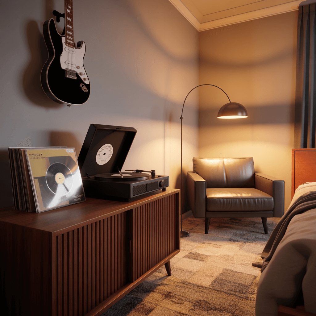 When music is his main passion, the room should reflect that. This theme blends retro cool with modern practicality, creating a space that’s perfect for both solo listening sessions and hanging out with friends.