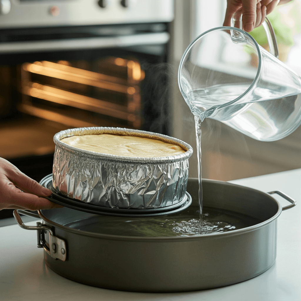 Place the foil-wrapped pan into your large roasting pan. Carefully pour hot water into the roasting pan until it comes about halfway up the sides of the springform pan.