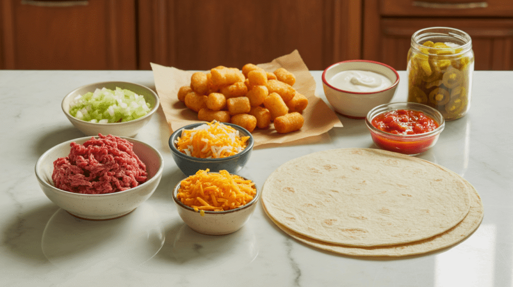 If you’re using frozen fries or tater tots, get these cooking first according to the package directions. You want them golden and crispy. While they’re baking, you can get everything else ready. Think of it as efficient multitasking.
